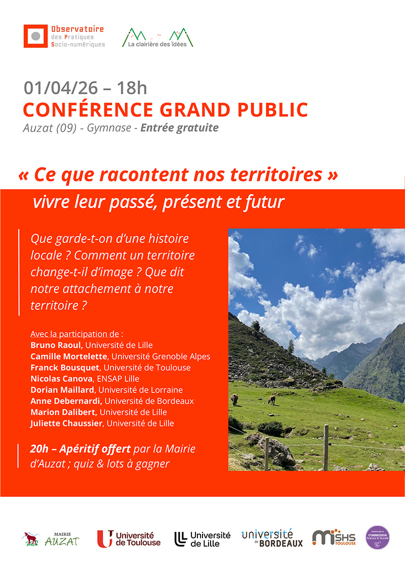 Le village d’Auzat (09220) accueille une nouvelle résidence scientifique portée par l’OPSN (Observatoire des pratiques socionumériques), en lien avec la MSHS-T (Maison des sciences humaines et sociales de Toulouse) et l’Université de Toulouse, en partenariat avec la mairie d’Auzat. C'est dans ce cadre qu'aura lieu la conférence grand public "Ce que racontent nos territoires : vivre leur passé, leur présent et leur futur", en compagnie des scientifiques.