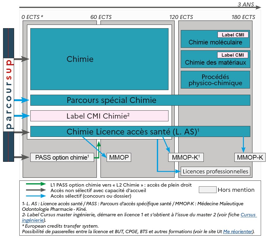 Les Licences « flexibles » s’appuient sur un ensemble d’Unités d’Enseignement (UE) obligatoires ou à choix permettant aux étudiants de s’inscrire dans un itinéraire permettant la validation de 180 ECTS (ECTS : système de crédits européens), sur une base de 60 ECTS par an. Le choix de l’itinéraire se fait en concertation étroite avec une direction des études et dépend de la formation antérieure, des orientations scientifiques et du projet professionnel de l’étudiant.- Licence Chimie : l'accès est non sélectif. Les étudiants ayant suivi les spécialités recommandées suivent le parcours dans aménagements. Les étudiants ayant suivi d'autres spécialités ou dont les acquis en terminale sont à renforcer ont accès à différents aménagements (soutien en chimie, remise à niveau en mathématiques et ou en physique, accompagnent personnalisé).