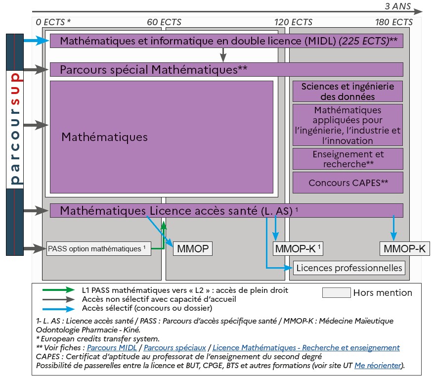 - Le parcours Parcours spécial mathématiques (PSM) propose une formation sélective à exigence renforcée pour préparer à la recherche. Il offre un double diplôme délivrant en plus de la licence le Diplôme d’Université Parcours Spécial (DUPS) validant des activités de recherche.