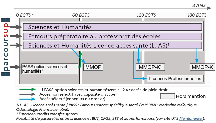 La mention propose une Licence Accès Santé (L. AS) Sciences et Humanités - option Santé, 1re année de licence à capacité d’accueil limité permettant de préparer l’entrée dans les filières de santé.